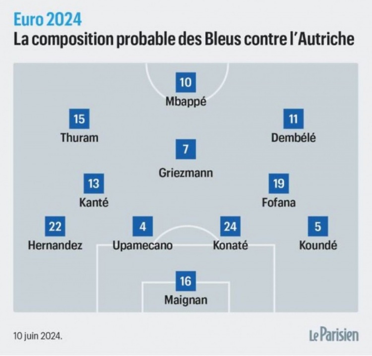 6月11日讯,随着欧洲杯开赛在即,法国《巴黎人报》对即将到来的法国队与奥地利队的比赛进行了详细预测,揭示了可能的首发阵容。法国队的锋线将由姆巴佩和登贝莱两位进攻利器领衔,这无疑是比赛的一大亮点。